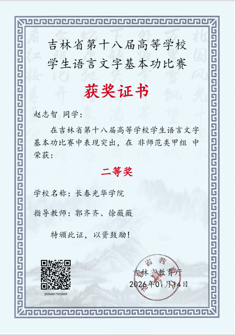 大赛设置语言文字知识测查、能力表现测试、硬笔规范汉字书写三项比赛,经过激烈角逐,我校斩获团体二等奖;郭齐齐、徐薇薇两位老师获评优秀指导教师;文学院学生赵志智荣获个人二等奖,闫春煜荣获个人三等奖。
