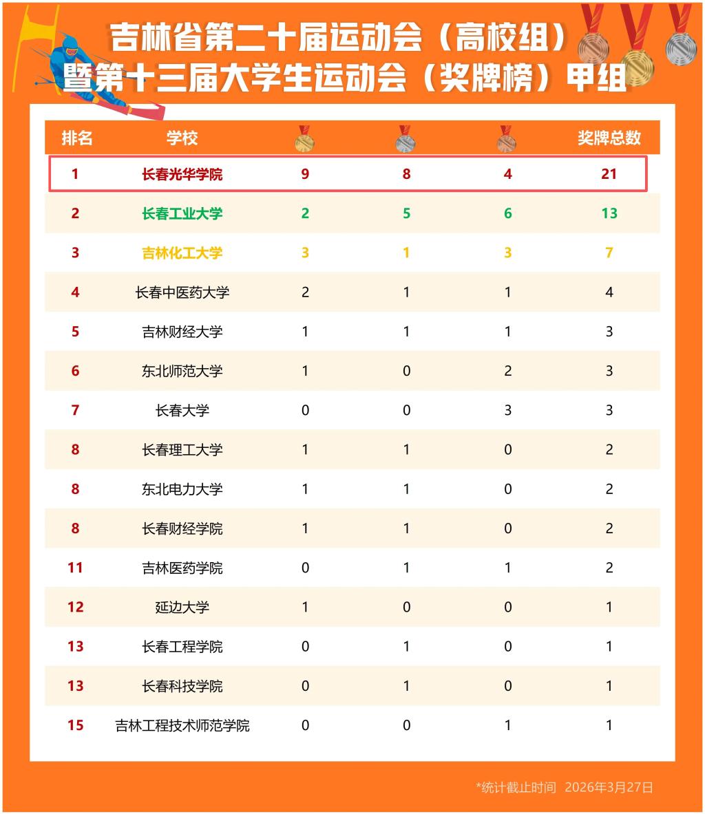 近日,吉林省第二十届运动会(高校组)暨第十三届大学生运动会赛事激战正酣。截至目前,我校代表团在甲组赛事中表现卓越,奖牌榜、总分榜均暂列全省第一,以昂扬姿态展现了光华学子的体育风采与拼搏精神,也为长春筹备2027年第33届世界大学生冬季运动会凝聚了青春力量、展现了高校担当。