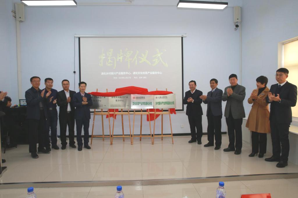 我校康启鹏董事长与通化县刘忠波副县长共同为 “通化乡村振兴产业服务中心、通化文化创意产业服务中心”、“长春光华学院乡村振兴产业学院通化分院”、“长春光华学院文化创意产业学院通化分院”揭牌