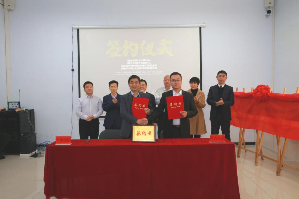 随后,通化聚鑫双创产业园董事长单宝君分别从场地建设、团队组建、取得的成绩、未来发展规划对园区工作进行了详细介绍。我校副校长李晓光与通化聚鑫双创产业园董事长单宝君共同签署了《长春光华学院服务地方产业合作协议》。我校董事长康启鹏董与通化县副县长刘忠波共同为“通化乡村振兴产业服务中心”、“通化文化创意产业服务中心”、“长春光华学院乡村振兴产业学院通化分院”、“长春光华学院文化创意产业学院通化分院”揭牌。
