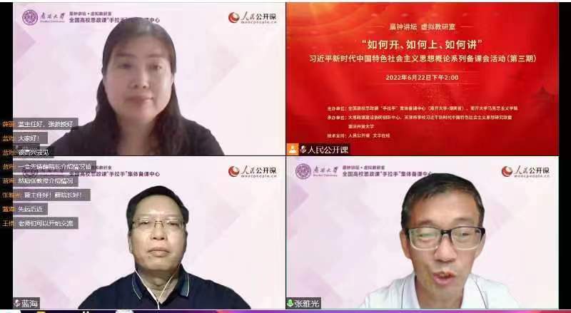 6月22日,由全国高校思政课“手拉手”集体备课中心(南开大学——湖南省)、南开大学马克思主义学院主办,大思政课建设协同创新中心、天津市学校习近平新时代中国特色社会主义思想研究联盟、重庆开放大学承办的集体备课活动暨习近平新时代中国特色社会主义思想概论系列备课会(第三期)成功举行。此次备课会聚焦习近平新时代中国特色社会主义思想概论“如何开、如何上、如何讲”这一主题。我校马克思主义学院院长薛丽受邀参加此次备课会。