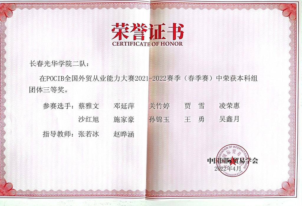 由中国国际贸易学会主办的“第十一届POCIB全国外贸从业能力大赛(春季赛)”于2022年4月29日上午10时圆满结束。本次大赛共114个本科院校参赛,我校商学院国际经济与贸易专业四位教师王荣、赵畅、张若冰、赵晔涵带领2019级20名同学组成2队参加了本次比赛。在长达15天马拉松式的赛程中,参赛同学顽强拼搏,取得团体二等奖1项,团体三等奖1项,8名同学获得个人奖项,其中国贸19403班黄淑畅同学获得一等奖,国贸2019级郑怡然、凌荣慧、孙锦玉、雷雪晴、徐佳伟、王越航、辛欣获得三等奖。
