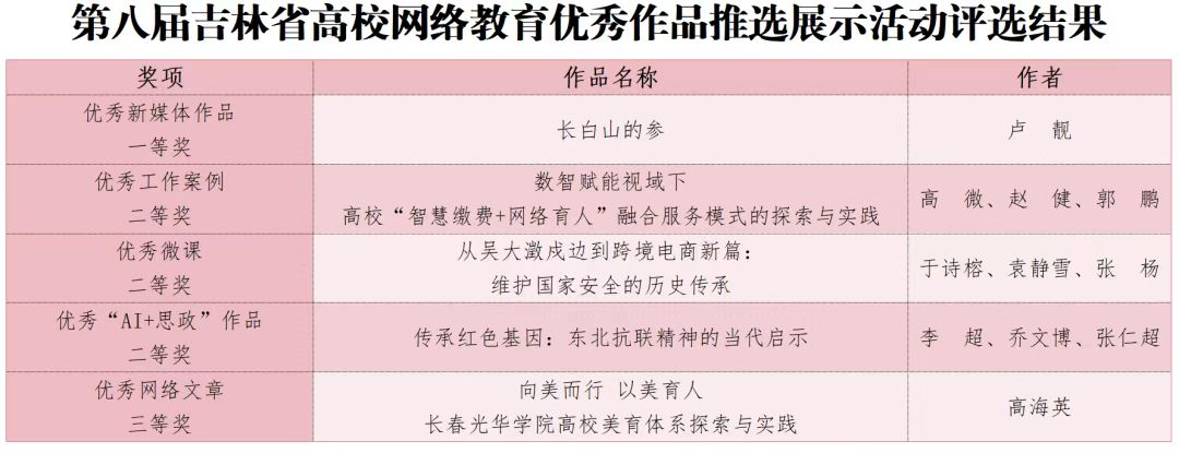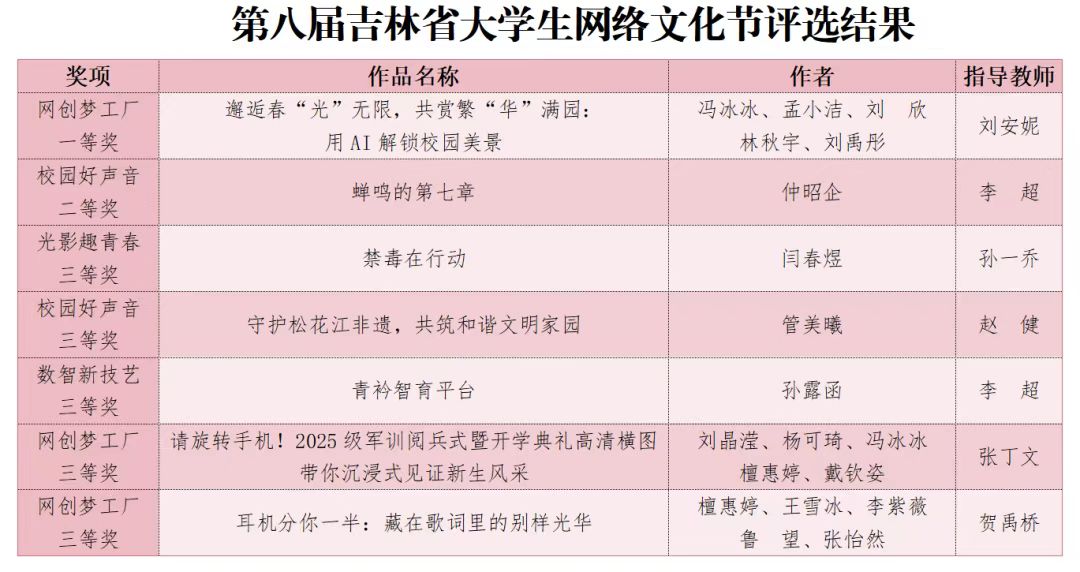 近日,第八届“吉林省大学生网络文化节”和“高校网络教育优秀作品推选展示活动”遴选结果正式揭晓。我校共有12件作品入选,其中一等奖2项、二等奖4项、三等奖6项。(供稿单位 :党委宣传部 编辑:刘安妮 初审:刘安妮 复审:曹红梅 终审:赵 健)